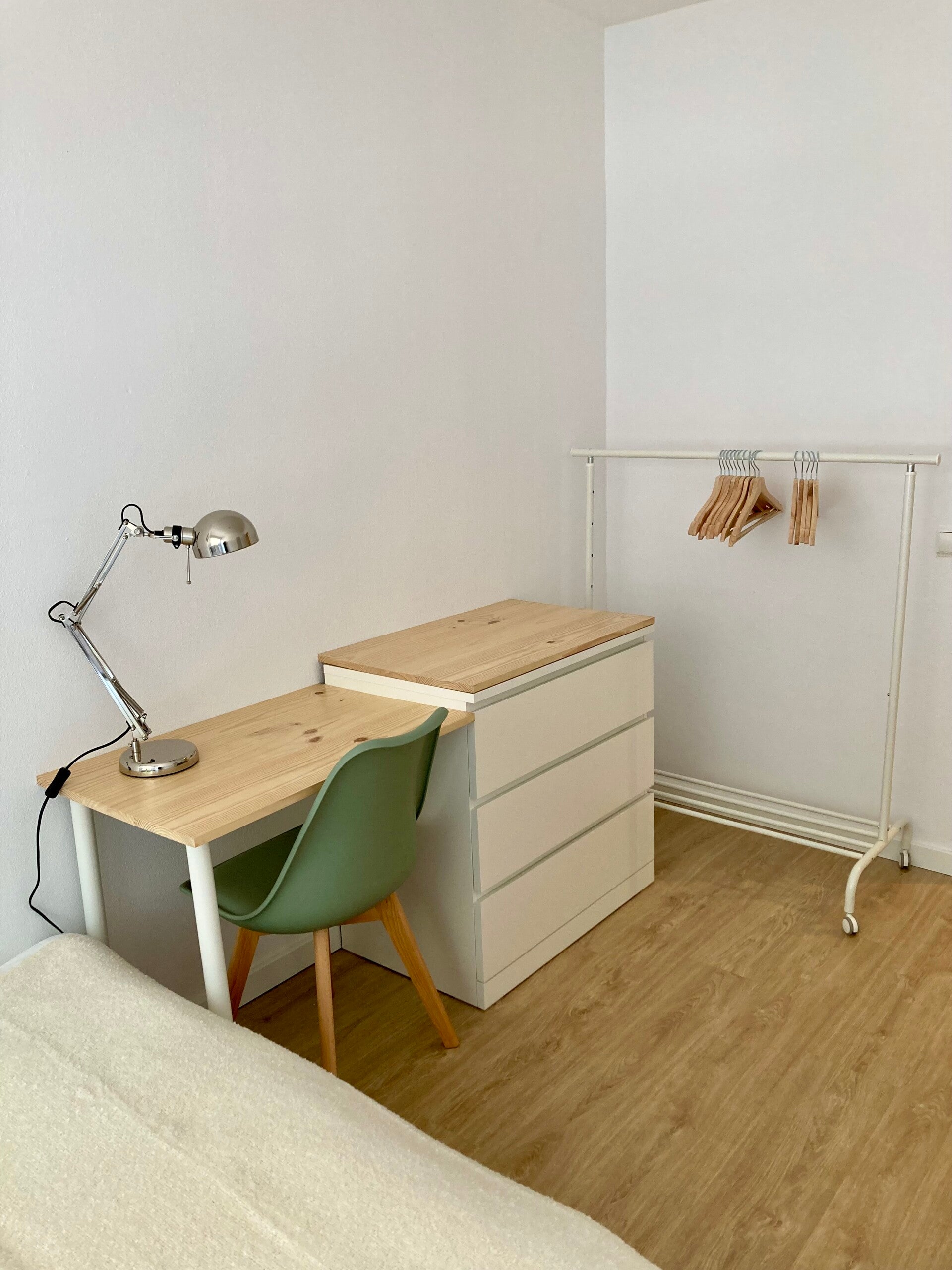 Single room with a private bathroom (with shower) in a shared apartment with 3 bedrooms, one per person, ensuring privacy and comfort. The room is very bright and has a key for greater security, as well as storage options such as chest of drawers and coat rack, desk and mirror. The common areas include a living room decorated with a dining table, sofa, reading corner and common storage spaces and a fully equipped kitchen.